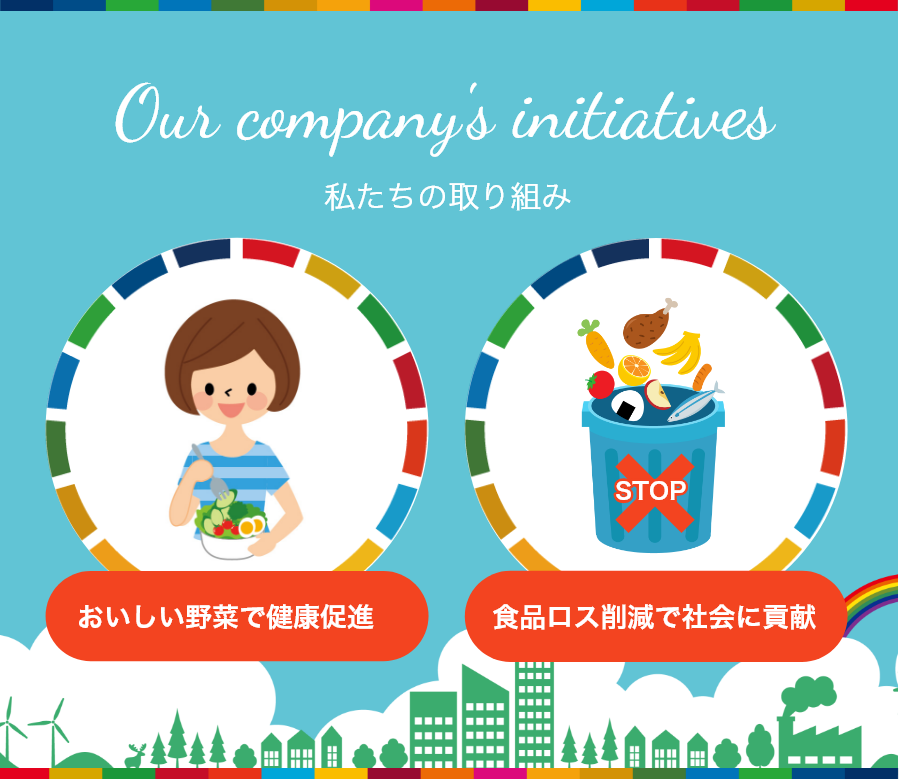 社員の健康促進と食品ロス削減を同時に実現する取り組みとして、形やサイズが不揃いな規格外野菜を購入するSDGsの活動を行っています。